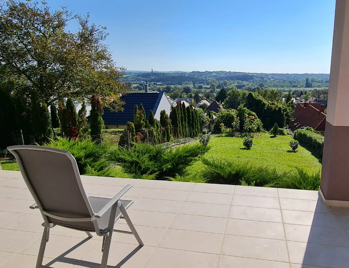 Nyugodt, zöld környezet, panorámás kilátás a városra és a természetre.