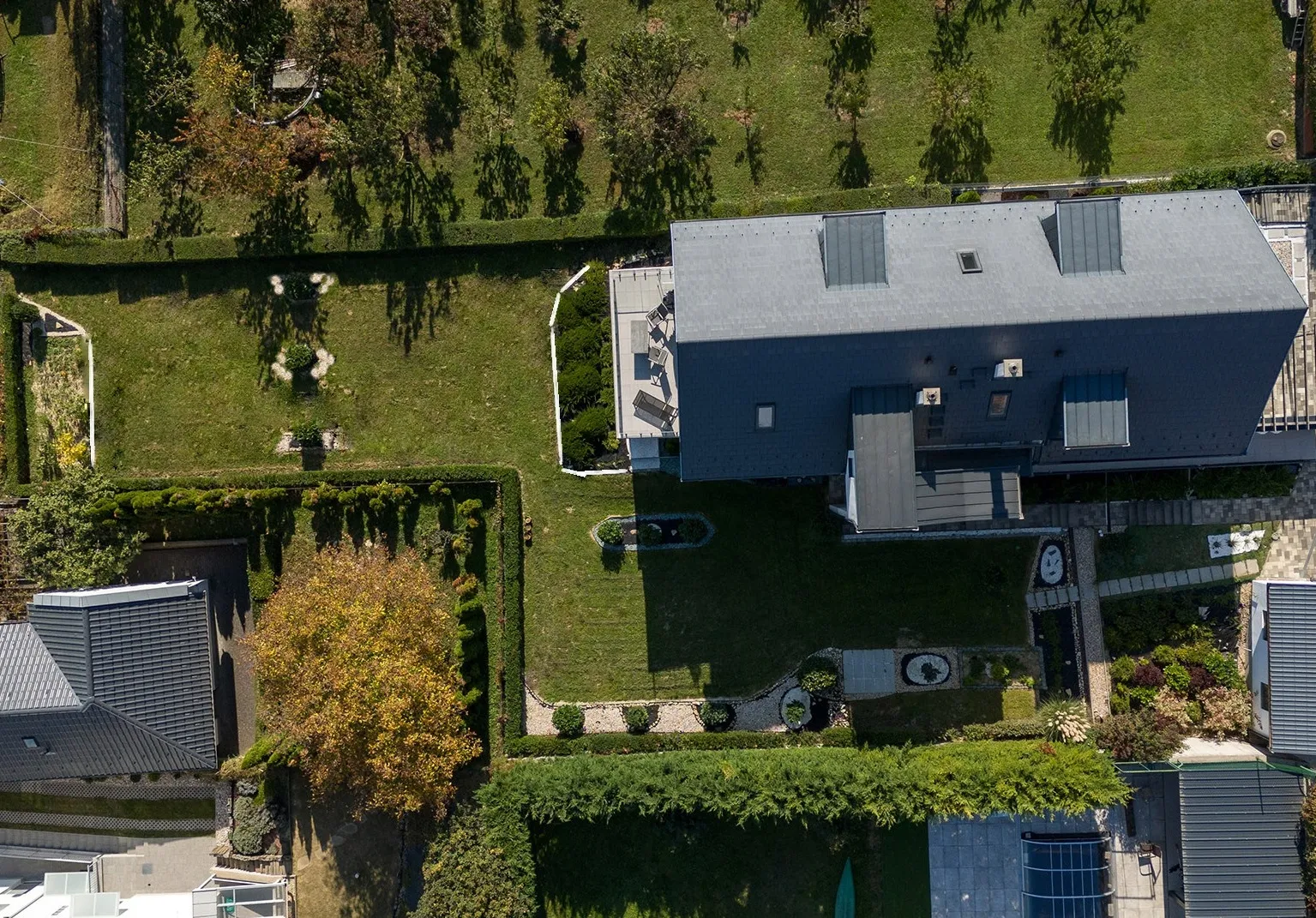 A kertet élősövény választja el a szomszédtól, tavasszal virágzó gyümölcsfákkal — tényleg képeslap-hangulat. Itt úgy élhet, mintha saját családi háza lenne, csak a tető, a homlokzat és a közös terület fenntartásával nem Önnek kell foglalkoznia.